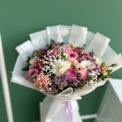 سلة ورد بلون ابيضّ مع دب لون وردي