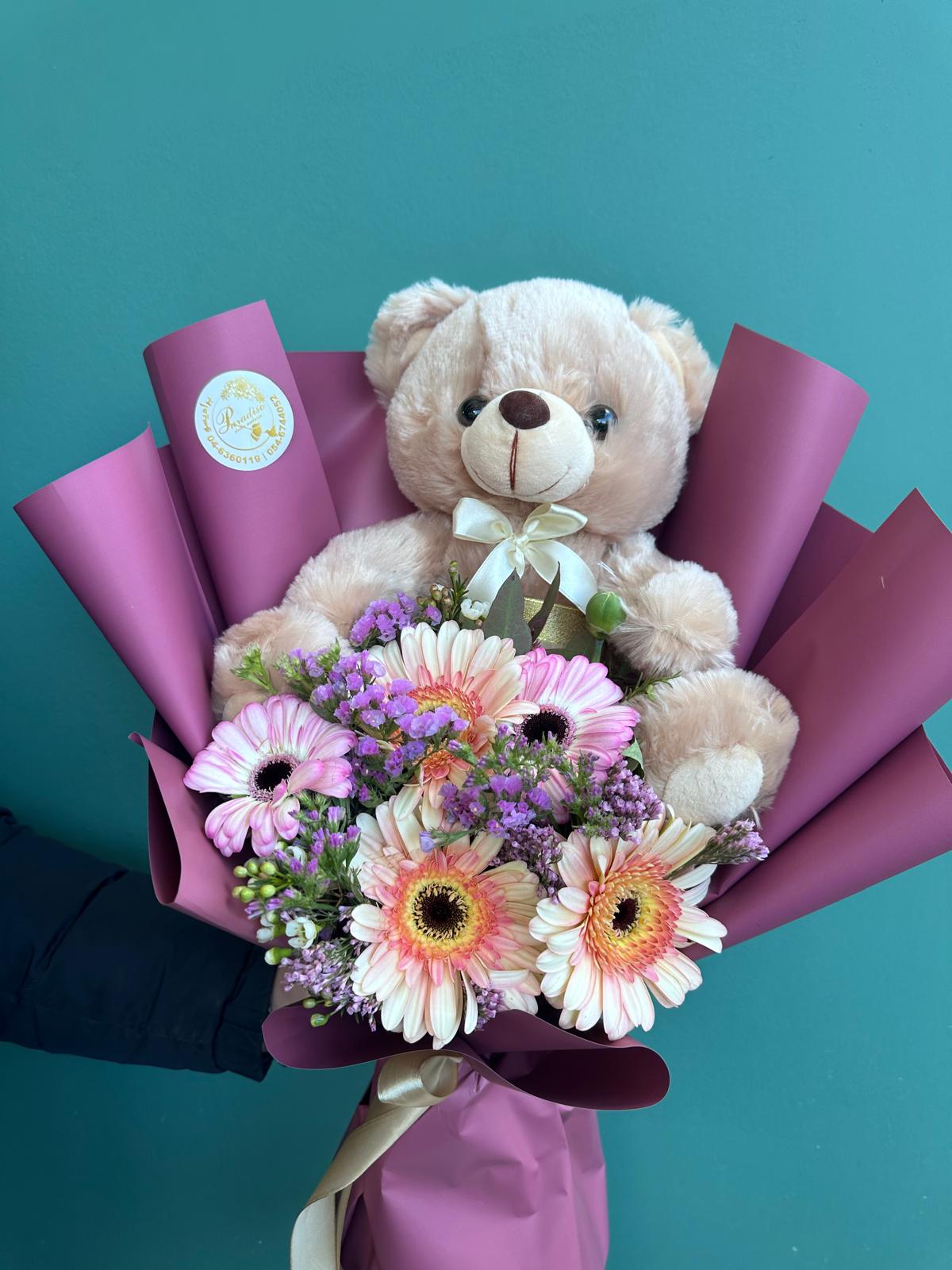 سلة ورد بلون ابيضّ مع دب لون وردي