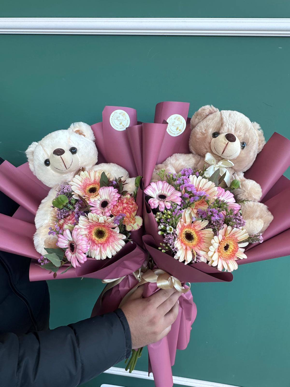 باقتين ورد مع دب لون ابيض ودب لون بني
