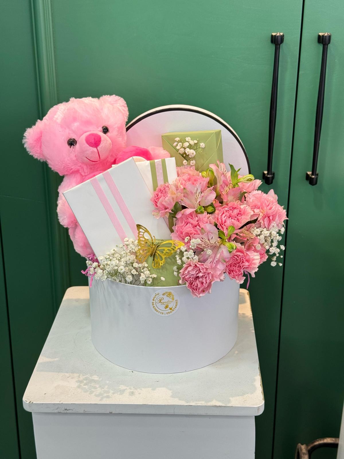 سلة ورد بلون ابيضّ مع دب لون وردي