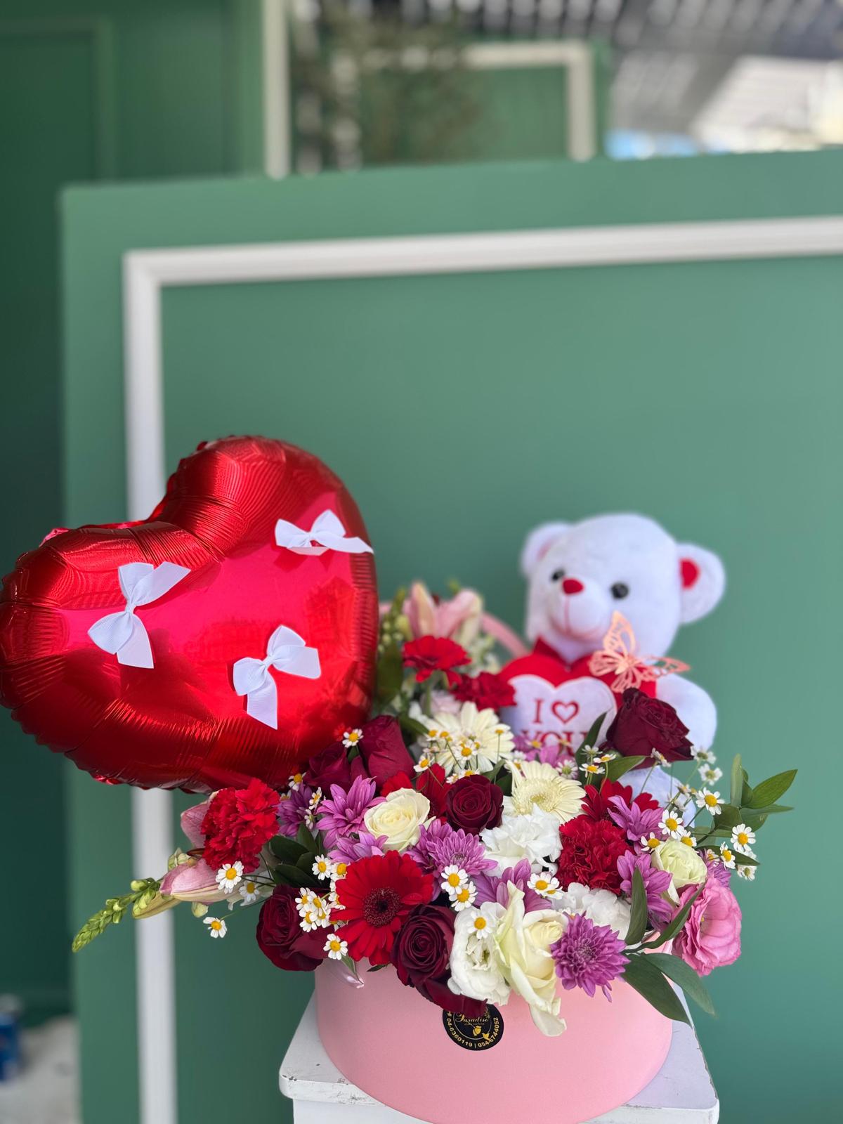 سلة ورد بلون احمر مع دب