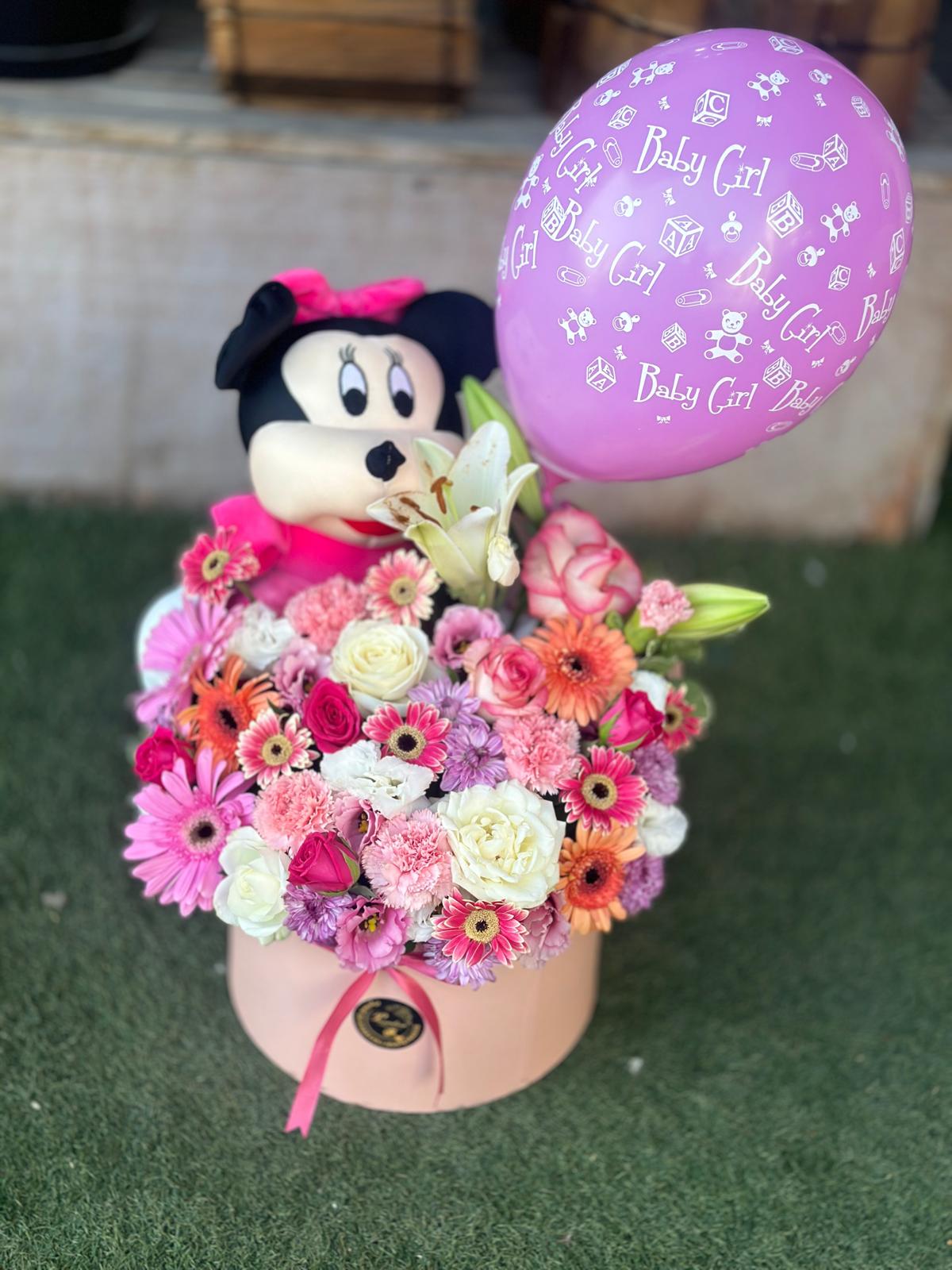 سلة ورد بلون ابيضّ مع دب لون وردي