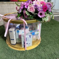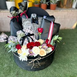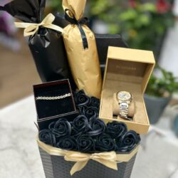 مجموعة هدايا مع ورد وسلة بلون اسود