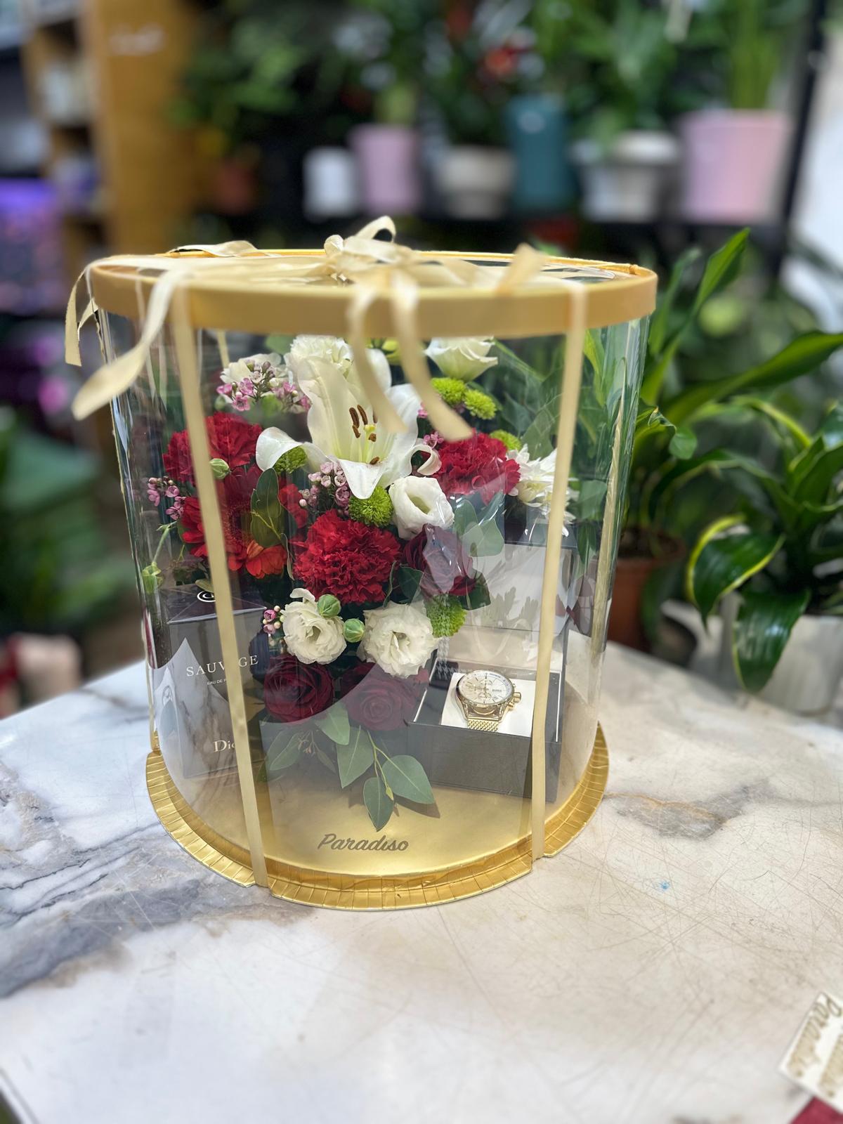 هدايا مع باقة ورد بصندوق شفاف