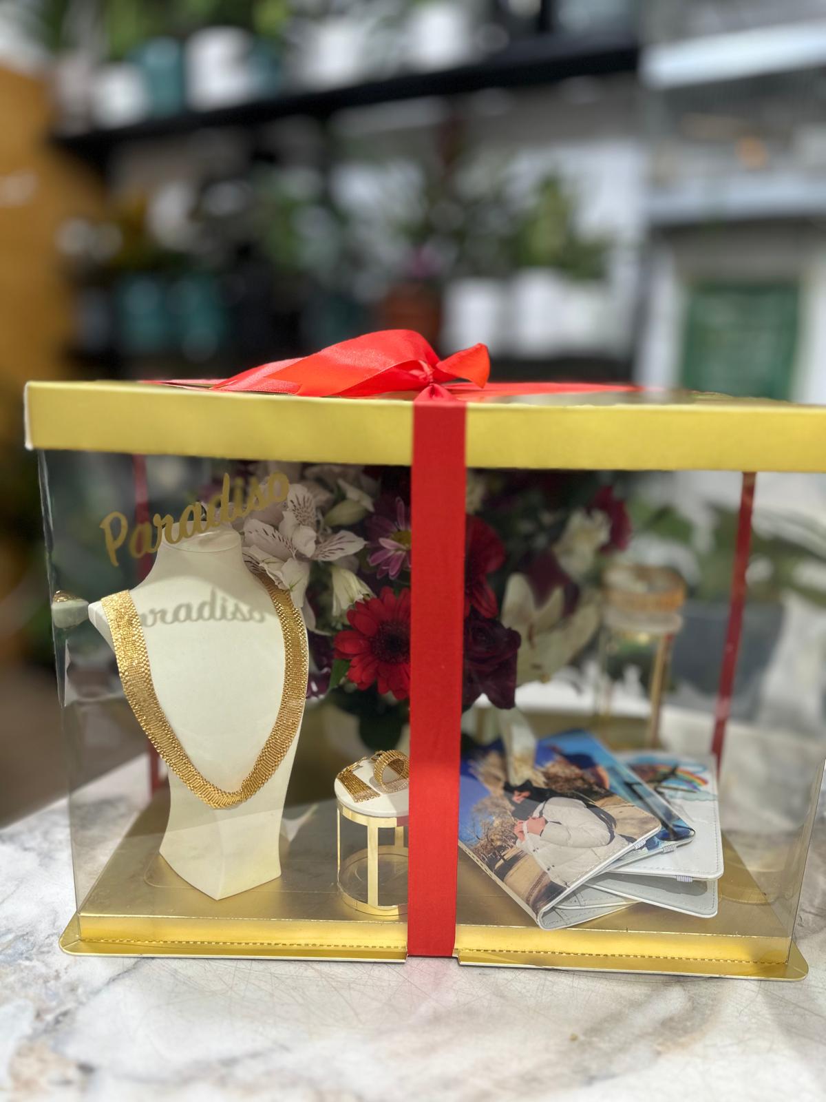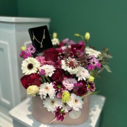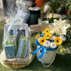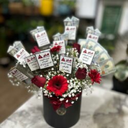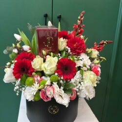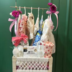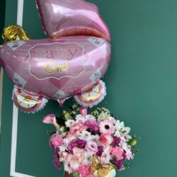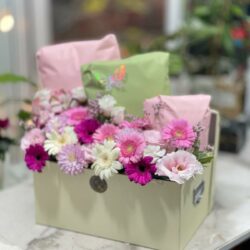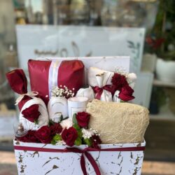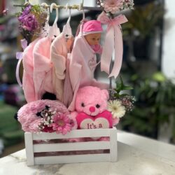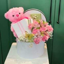سلة ورد بلون ابيضّ مع دب لون وردي